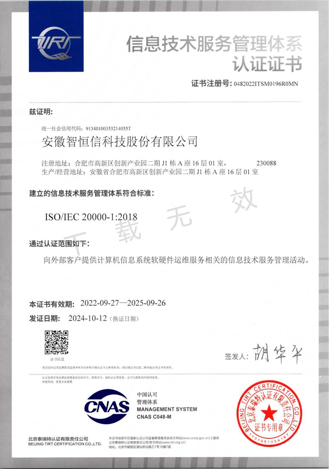 服务管理体系认证证书